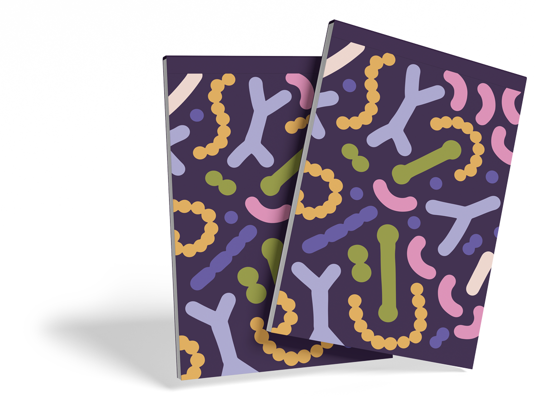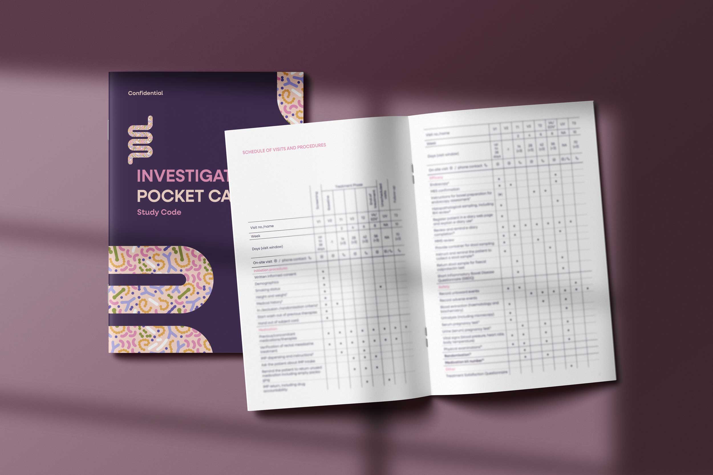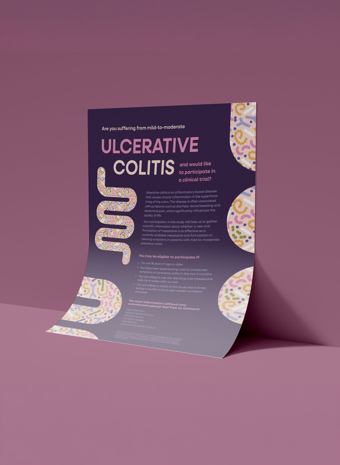 The design uses bold violet and pink tones to immediately catch the eye and specifically target individuals with Ulcerative Colitis. The large ULCERATIVE COLITIS lettering ensures that the topic is prominently highlighted. Graphic elements, like the stylized representation of the intestine, visually establish a clear connection to the disease and emphasize the medical context. The dark background was intentionally chosen to stand out in the typically bright and clinical environments of doctor's offices. The branding is deliberately strong and visible, aiming to build trust and put the clinical study at the forefront while encouraging patients to participate.